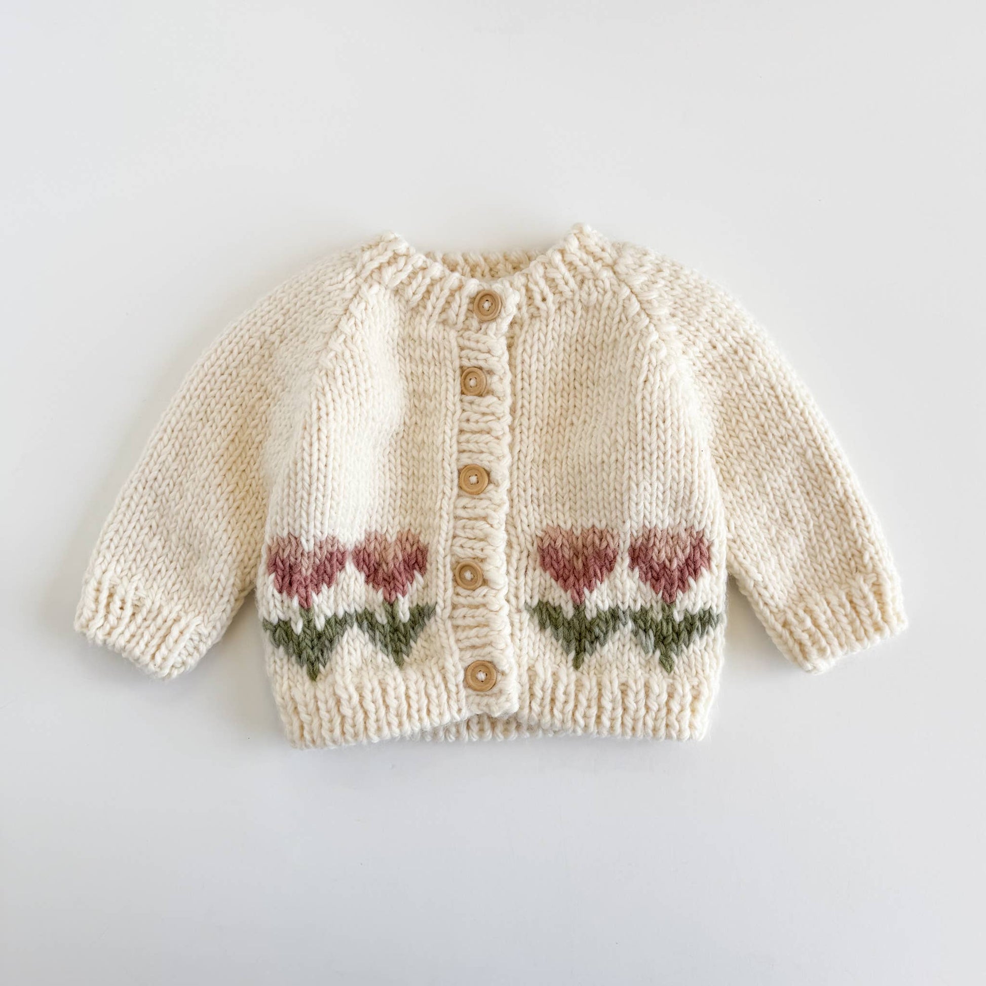 Wrap your little one in floral charm. Crafted with care, our hand-knit, cozy cardigan will keep your little one warm and stylish. This matches perfectly with our Flower Beanie. 100% Hand-knit Acrylic. - Hand wash and lay flat to dry.